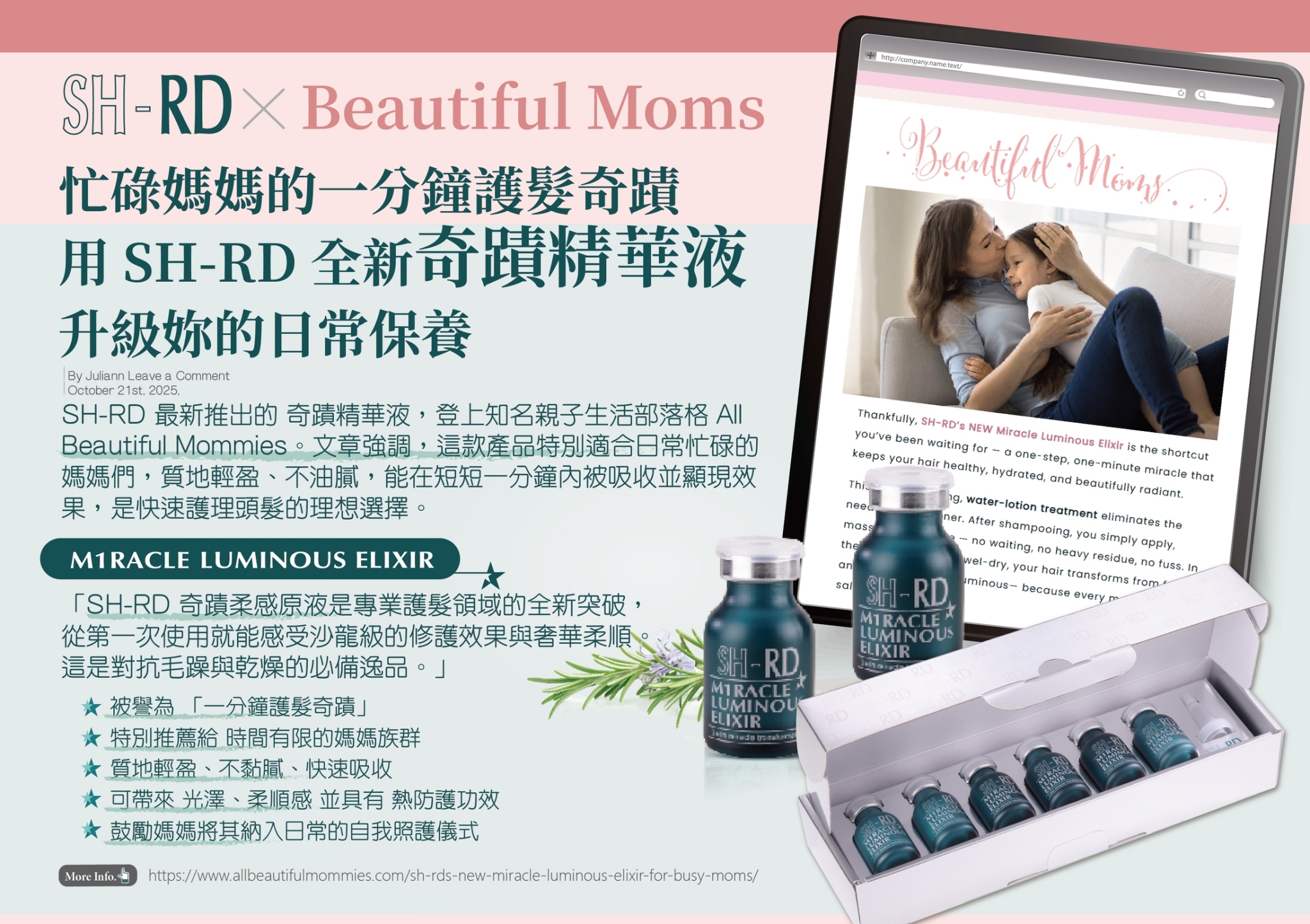 護髮神隊友來了!忙碌,不代表要犧牲美麗。 全新 SH-RD 奇蹟柔感原液 (Miracle Luminous Elixir) 專為沒時間上沙龍、卻渴望擁有好髮質的妳設計!美國部落格 《Motherhood Moment》 實測認證: ✅ 1分鐘即效修護:瞬間撫平毛躁,趕時間也能有天使光圈。 ✅ 強韌升級:髮絲彈性提升 23%,減少斷裂。 ✅ 輕盈不黏膩:獨家水乳質地,吸收超快!不管是因為染燙受損,還是產後髮質改變,只要1分鐘,給妳沙龍級的柔順奇蹟!此外,在知名親子部落格《ALL Beautiful Moms》的專題中,更以「忙碌媽媽的一分鐘護髮奇蹟」為主軸,分享奇蹟柔感原液如何幫助媽媽們在照顧家庭之餘,也能快速完成自我保養。文章中指出,透過簡單的1分鐘護髮步驟,就能讓頭髮從乾燥、毛躁轉為柔順亮澤,不只改善外在髮況,也讓媽媽們在忙碌生活中,找回屬於自己的自信時刻✨把愛留給孩子,也別忘了寵愛自己這不僅僅是一罐護髮精華,更是我們想送給所有忙碌女性的一份禮物。將它納入妳的日常自我照護儀式 (Self-care routine) 中,每天花 1 分鐘,看著鏡子裡柔亮順滑的秀髮,心情也會跟著亮起來💖